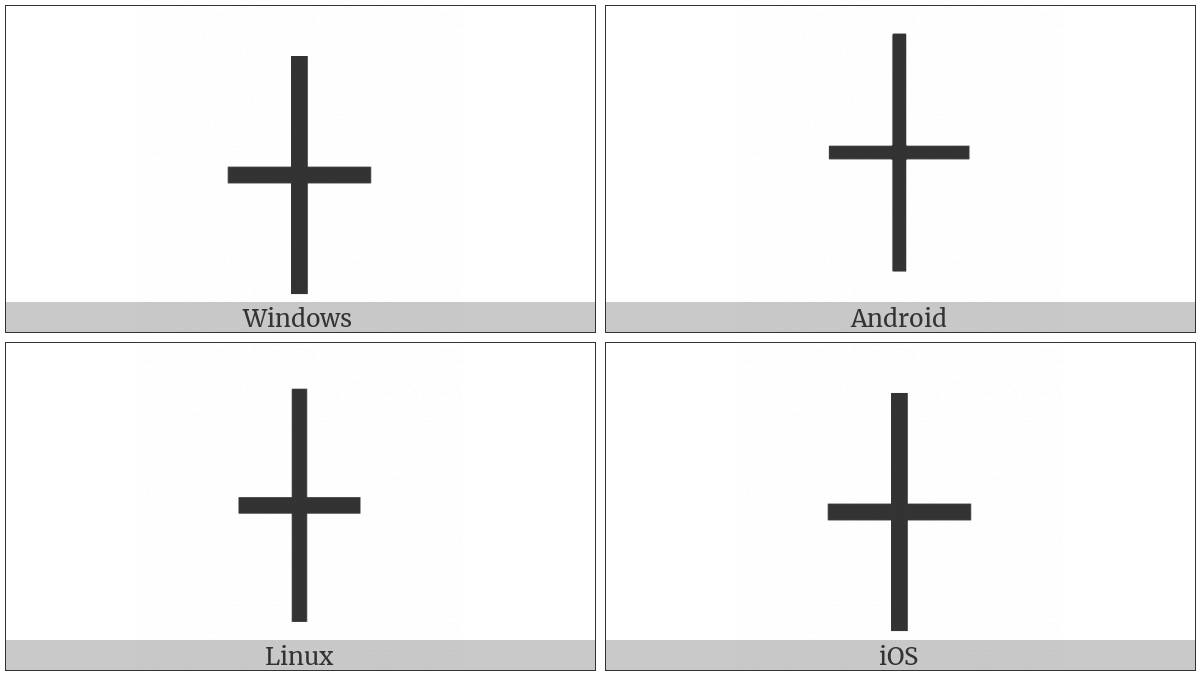 The image below shows how the “Box Drawings Light Vertical And Horizontal” symbol might look like on different operating systems. If the font in which this web site is displayed does not contain the symbol and there is no fallback font able to render it, you can use the image below to get an idea of what it should look like.