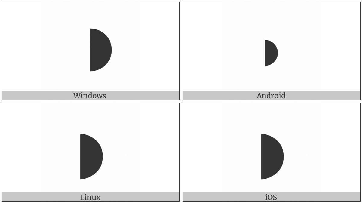 The image below shows how the “Right Half Black Circle” symbol might look like on different operating systems. If the font in which this web site is displayed does not contain the symbol and there is no fallback font able to render it, you can use the image below to get an idea of what it should look like.