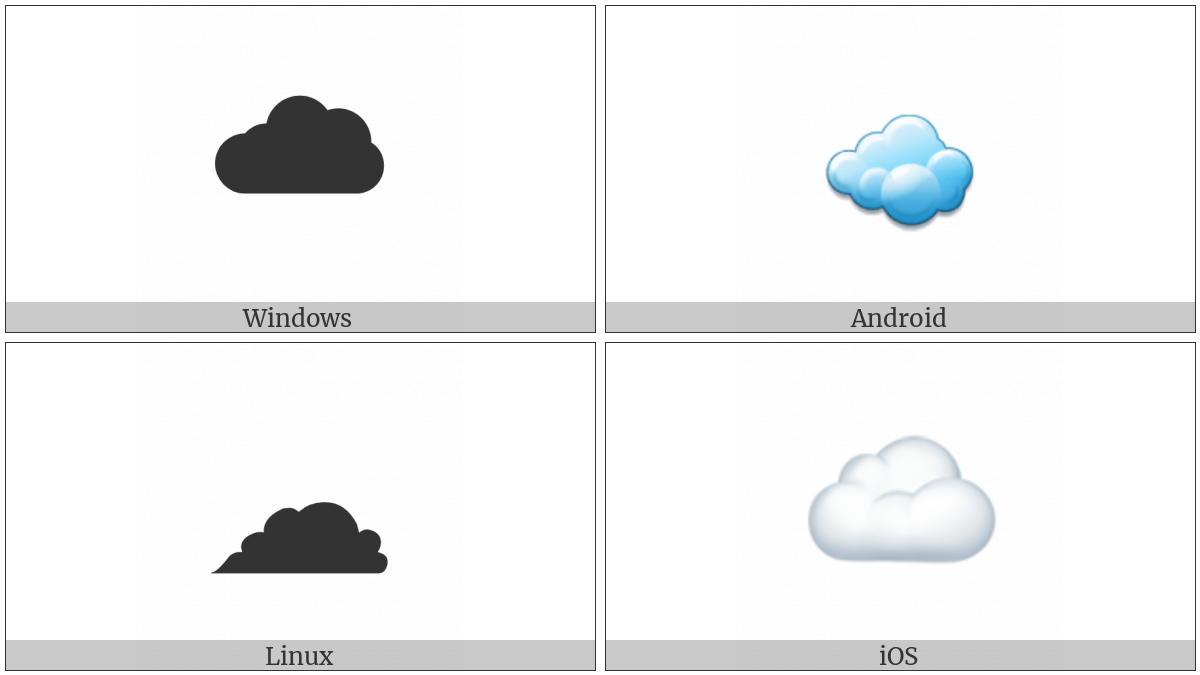 The image below shows how the “Cloud” symbol might look like on different operating systems. If the font in which this web site is displayed does not contain the symbol and there is no fallback font able to render it, you can use the image below to get an idea of what it should look like.