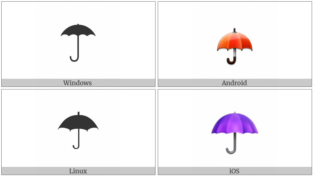 The image below shows how the “Umbrella” symbol might look like on different operating systems. If the font in which this web site is displayed does not contain the symbol and there is no fallback font able to render it, you can use the image below to get an idea of what it should look like.