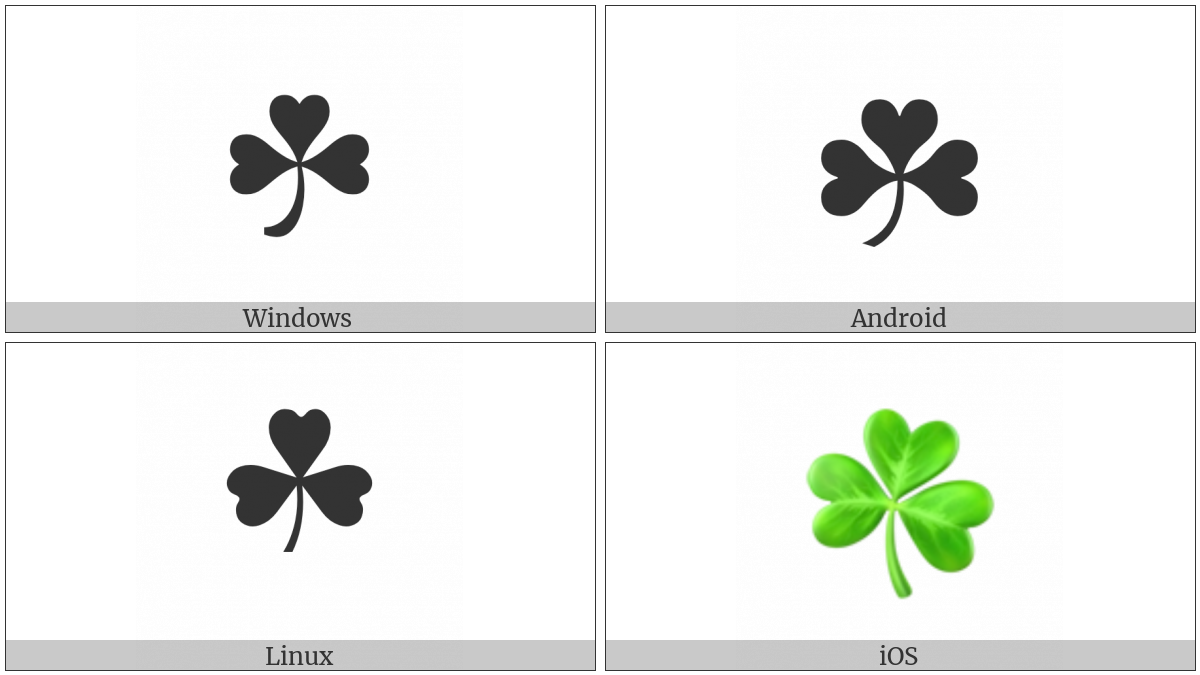 The image below shows how the “Shamrock” symbol might look like on different operating systems. If the font in which this web site is displayed does not contain the symbol and there is no fallback font able to render it, you can use the image below to get an idea of what it should look like.
