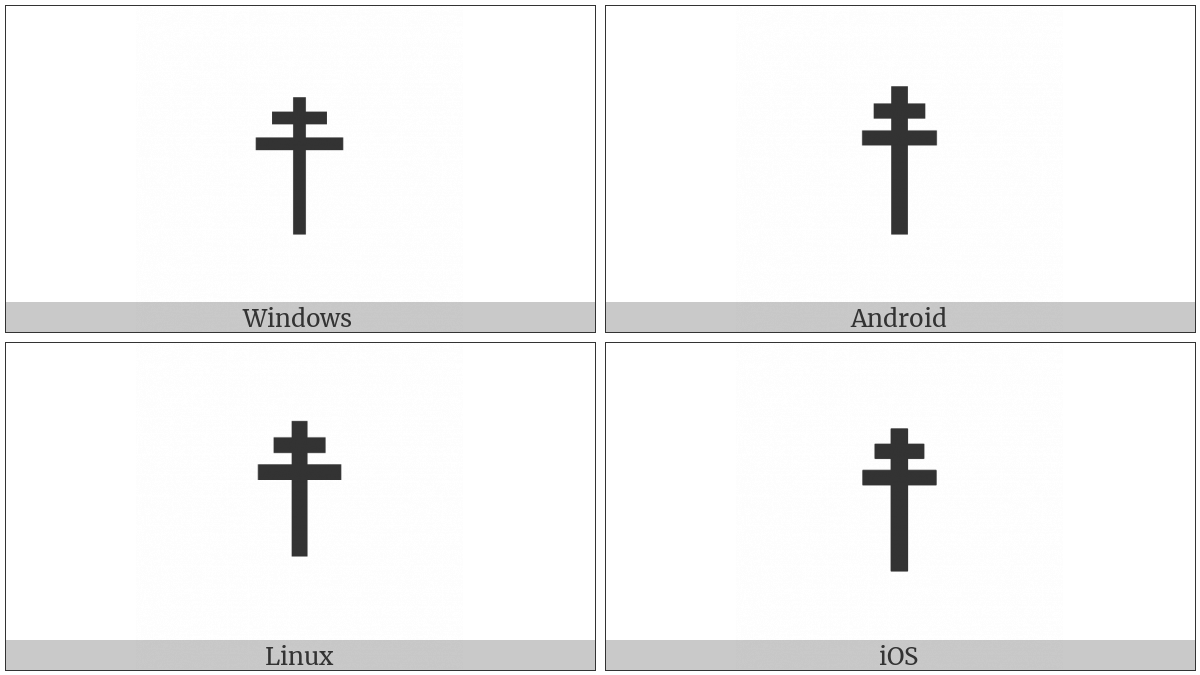 The image below shows how the “Cross Of Lorraine” symbol might look like on different operating systems. If the font in which this web site is displayed does not contain the symbol and there is no fallback font able to render it, you can use the image below to get an idea of what it should look like.