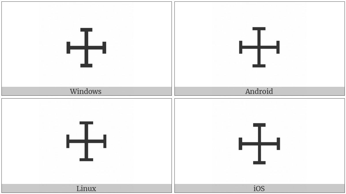 The image below shows how the “Cross Of Jerusalem” symbol might look like on different operating systems. If the font in which this web site is displayed does not contain the symbol and there is no fallback font able to render it, you can use the image below to get an idea of what it should look like.