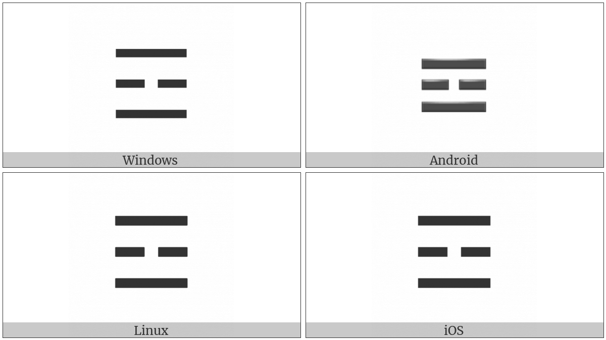 The image below shows how the “Trigram For Fire” symbol might look like on different operating systems. If the font in which this web site is displayed does not contain the symbol and there is no fallback font able to render it, you can use the image below to get an idea of what it should look like.