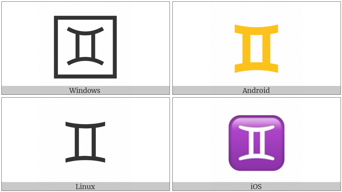 The image below shows how the “Gemini” symbol might look like on different operating systems. If the font in which this web site is displayed does not contain the symbol and there is no fallback font able to render it, you can use the image below to get an idea of what it should look like.