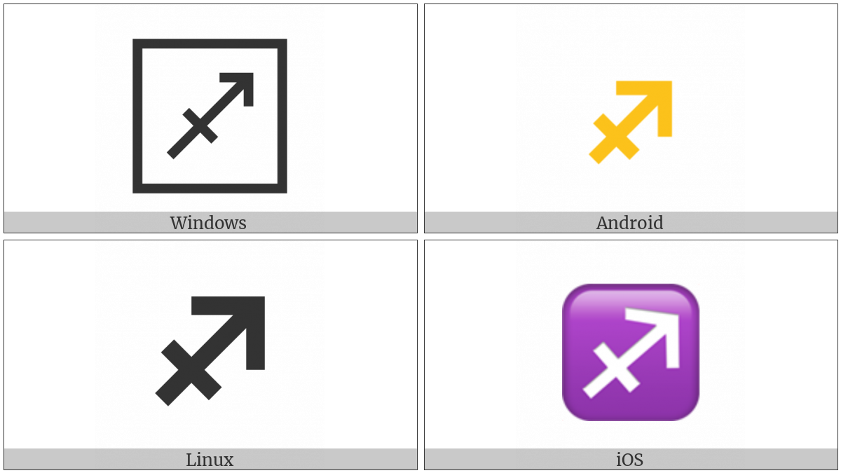 The image below shows how the “Sagittarius” symbol might look like on different operating systems. If the font in which this web site is displayed does not contain the symbol and there is no fallback font able to render it, you can use the image below to get an idea of what it should look like.