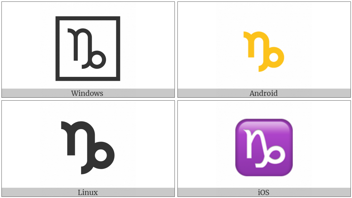 The image below shows how the “Capricorn” symbol might look like on different operating systems. If the font in which this web site is displayed does not contain the symbol and there is no fallback font able to render it, you can use the image below to get an idea of what it should look like.