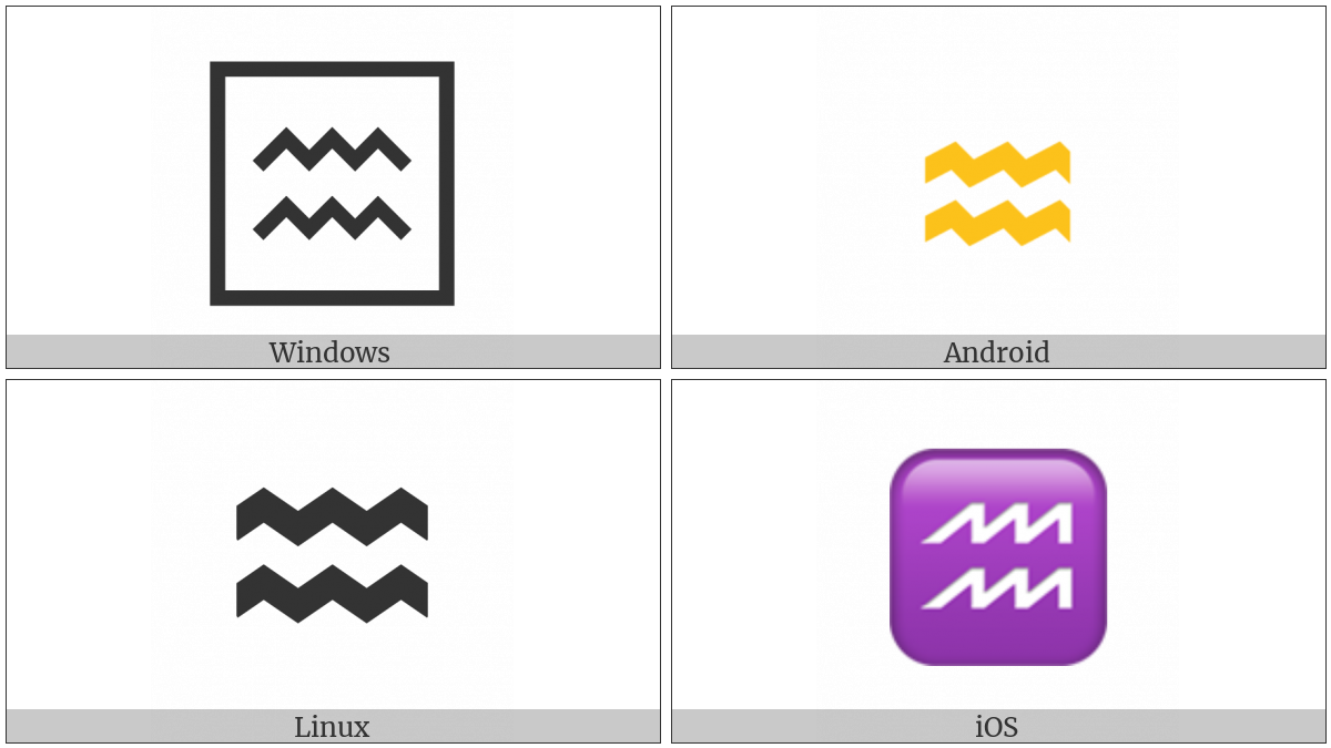 The image below shows how the “Aquarius” symbol might look like on different operating systems. If the font in which this web site is displayed does not contain the symbol and there is no fallback font able to render it, you can use the image below to get an idea of what it should look like.