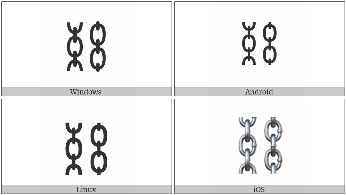 The image below shows how the “Chains” symbol might look like on different operating systems. If the font in which this web site is displayed does not contain the symbol and there is no fallback font able to render it, you can use the image below to get an idea of what it should look like.