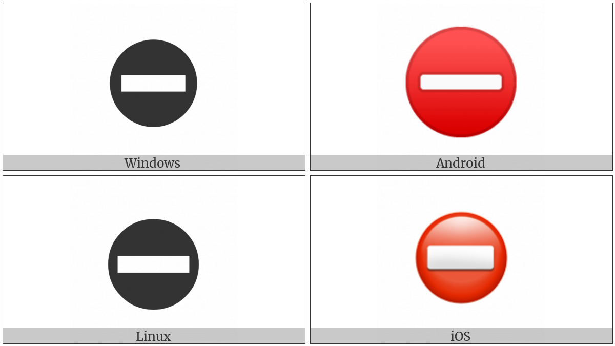 The image below shows how the “No Entry” symbol might look like on different operating systems. If the font in which this web site is displayed does not contain the symbol and there is no fallback font able to render it, you can use the image below to get an idea of what it should look like.