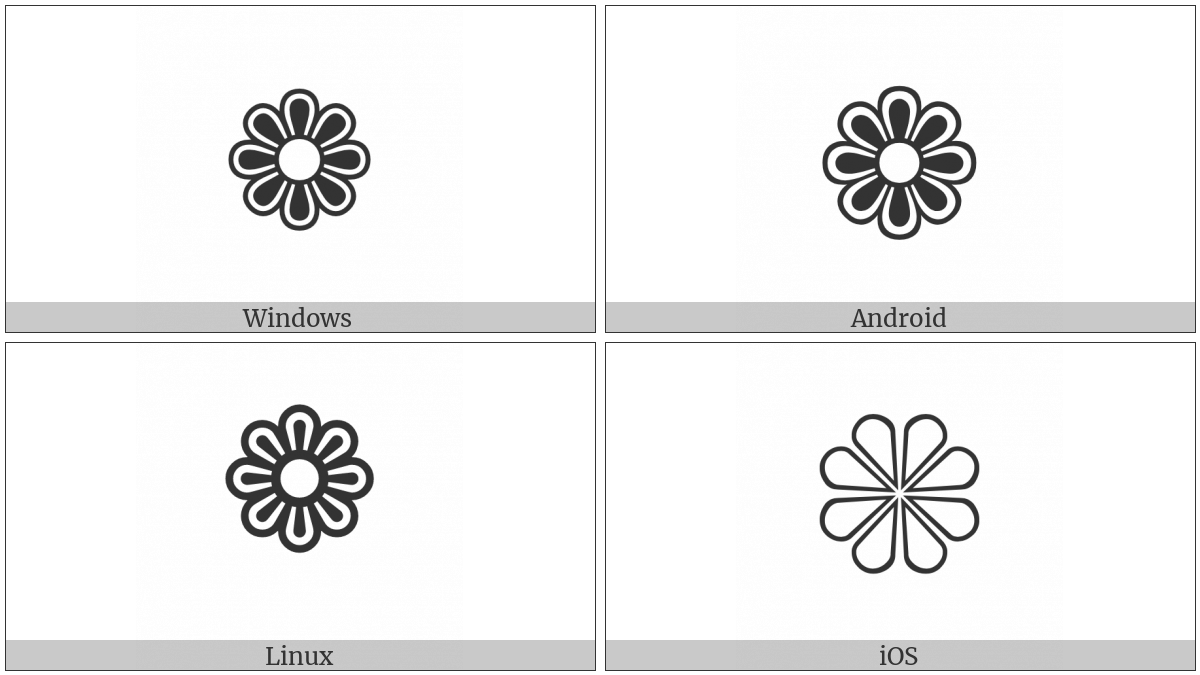 The image below shows how the “Eight Petalled Outlined Black Florette” symbol might look like on different operating systems. If the font in which this web site is displayed does not contain the symbol and there is no fallback font able to render it, you can use the image below to get an idea of what it should look like.