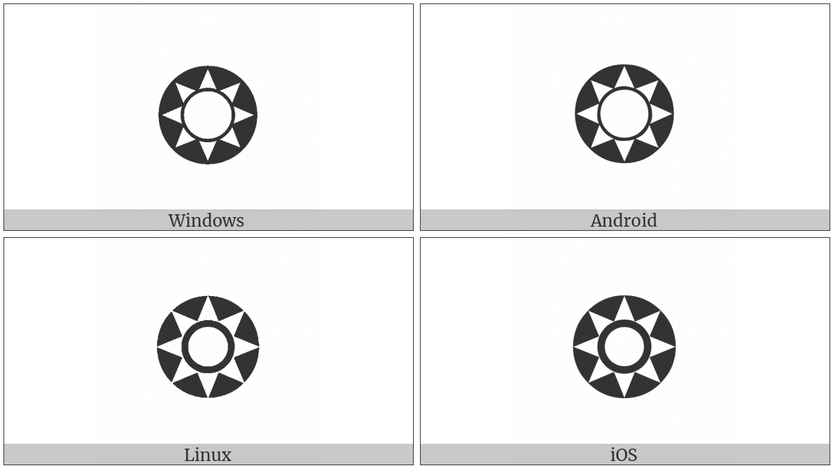 The image below shows how the “Circled Open Centre Eight Pointed Star” symbol might look like on different operating systems. If the font in which this web site is displayed does not contain the symbol and there is no fallback font able to render it, you can use the image below to get an idea of what it should look like.