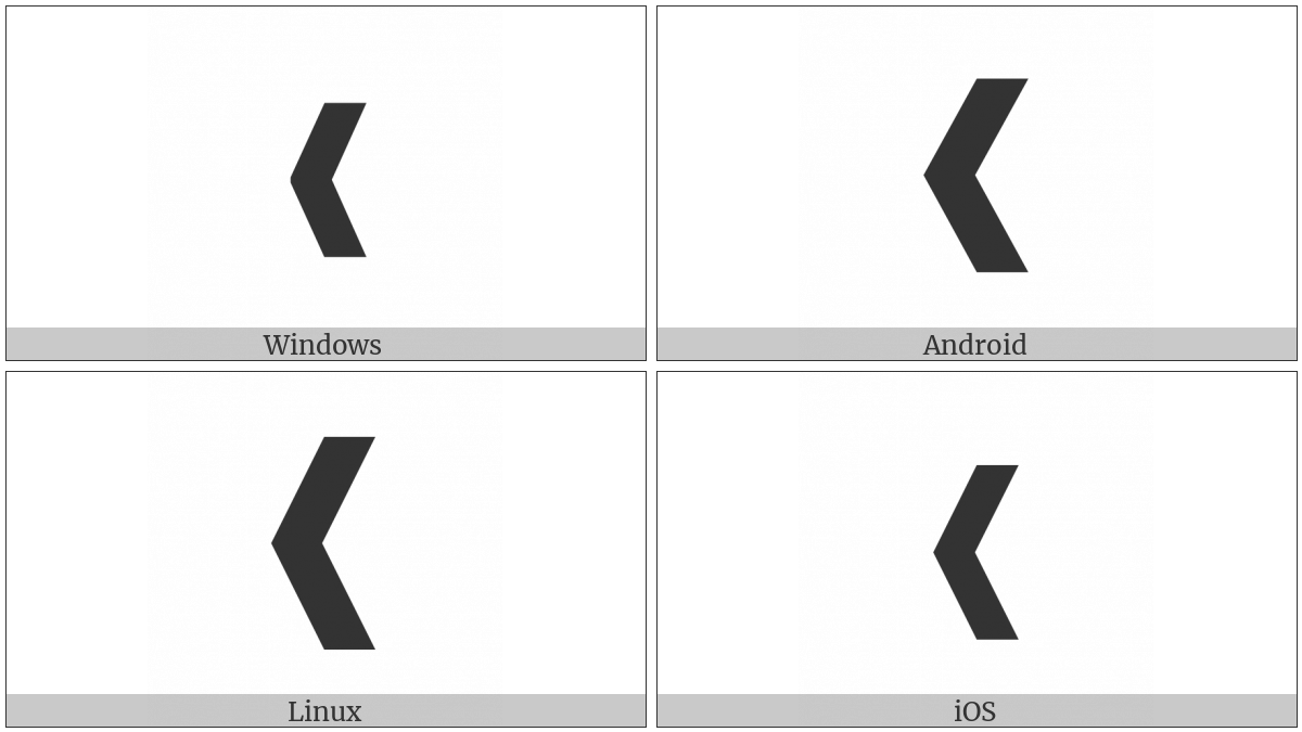 The image below shows how the “Heavy Left-Pointing Angle Bracket Ornament” symbol might look like on different operating systems. If the font in which this web site is displayed does not contain the symbol and there is no fallback font able to render it, you can use the image below to get an idea of what it should look like.