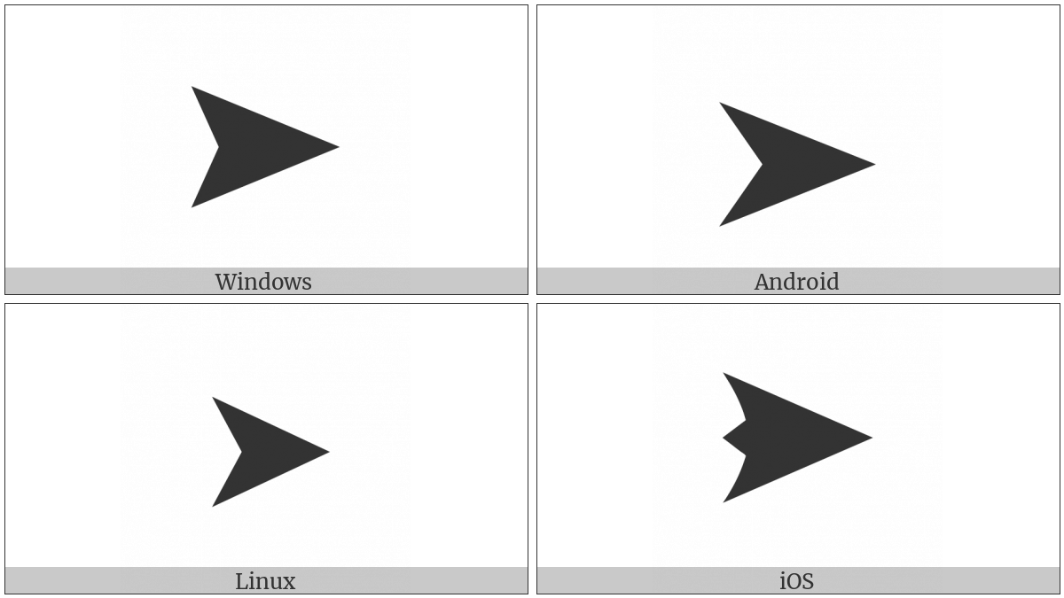 The image below shows how the “Black Rightwards Arrowhead” symbol might look like on different operating systems. If the font in which this web site is displayed does not contain the symbol and there is no fallback font able to render it, you can use the image below to get an idea of what it should look like.
