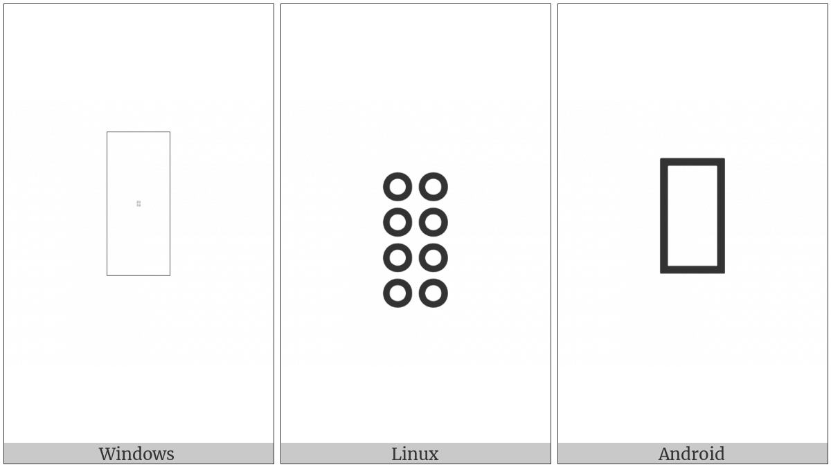 The image below shows how the “Braille Pattern Blank” symbol might look like on different operating systems. If the font in which this web site is displayed does not contain the symbol and there is no fallback font able to render it, you can use the image below to get an idea of what it should look like.