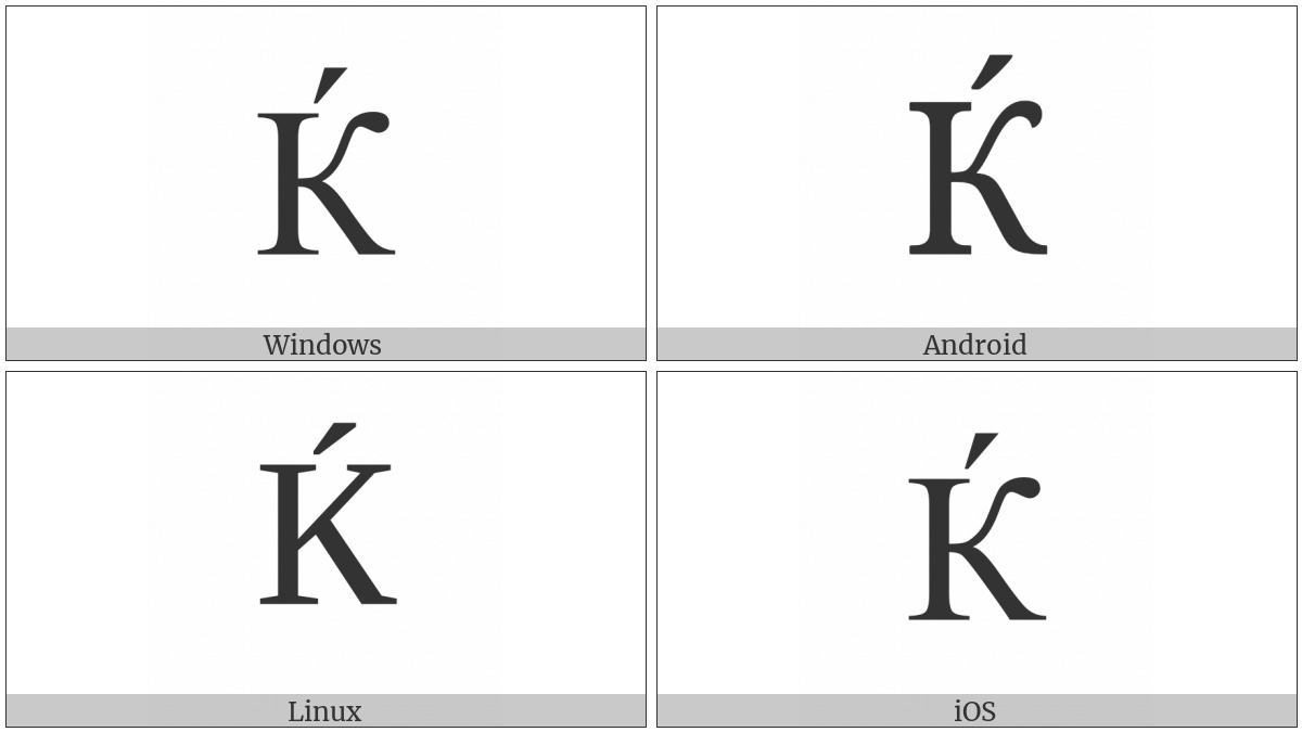 The image below shows how the “Cyrillic Capital Letter Kje” symbol might look like on different operating systems. If the font in which this web site is displayed does not contain the symbol and there is no fallback font able to render it, you can use the image below to get an idea of what it should look like.
