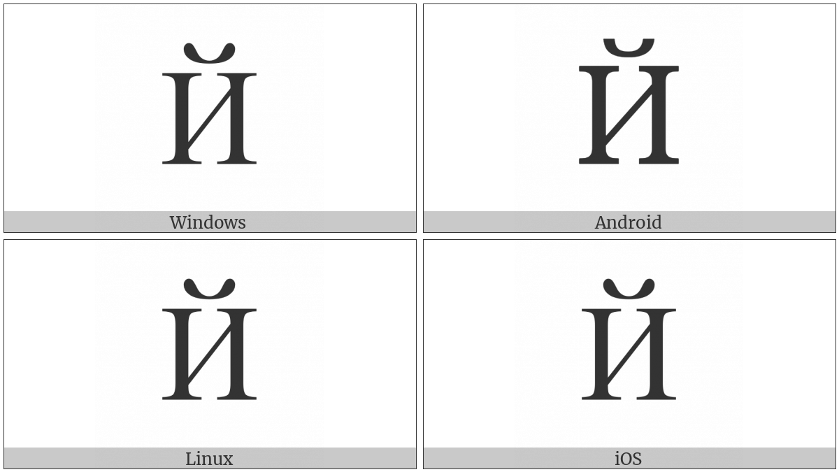 The image below shows how the “Cyrillic Capital Letter Short I” symbol might look like on different operating systems. If the font in which this web site is displayed does not contain the symbol and there is no fallback font able to render it, you can use the image below to get an idea of what it should look like.