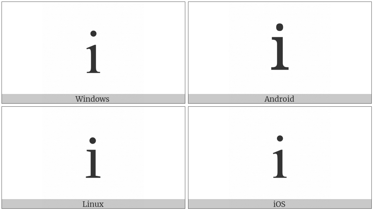 The image below shows how the “Latin Small Letter I” symbol might look like on different operating systems. If the font in which this web site is displayed does not contain the symbol and there is no fallback font able to render it, you can use the image below to get an idea of what it should look like.