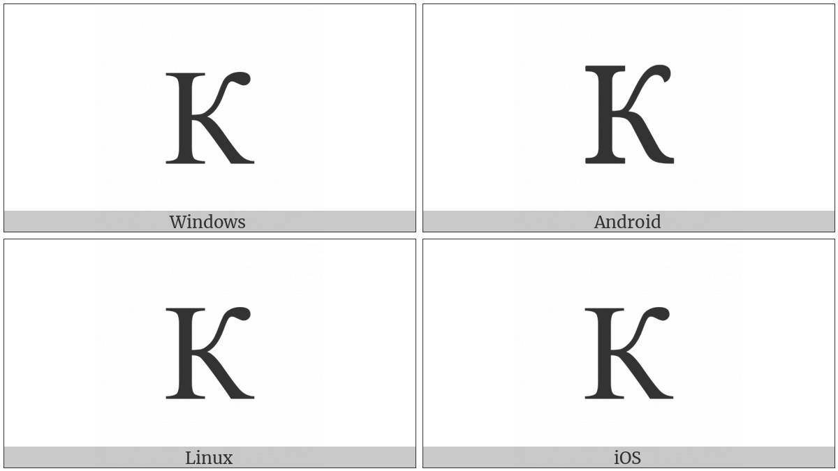 The image below shows how the “Cyrillic Capital Letter Ka” symbol might look like on different operating systems. If the font in which this web site is displayed does not contain the symbol and there is no fallback font able to render it, you can use the image below to get an idea of what it should look like.