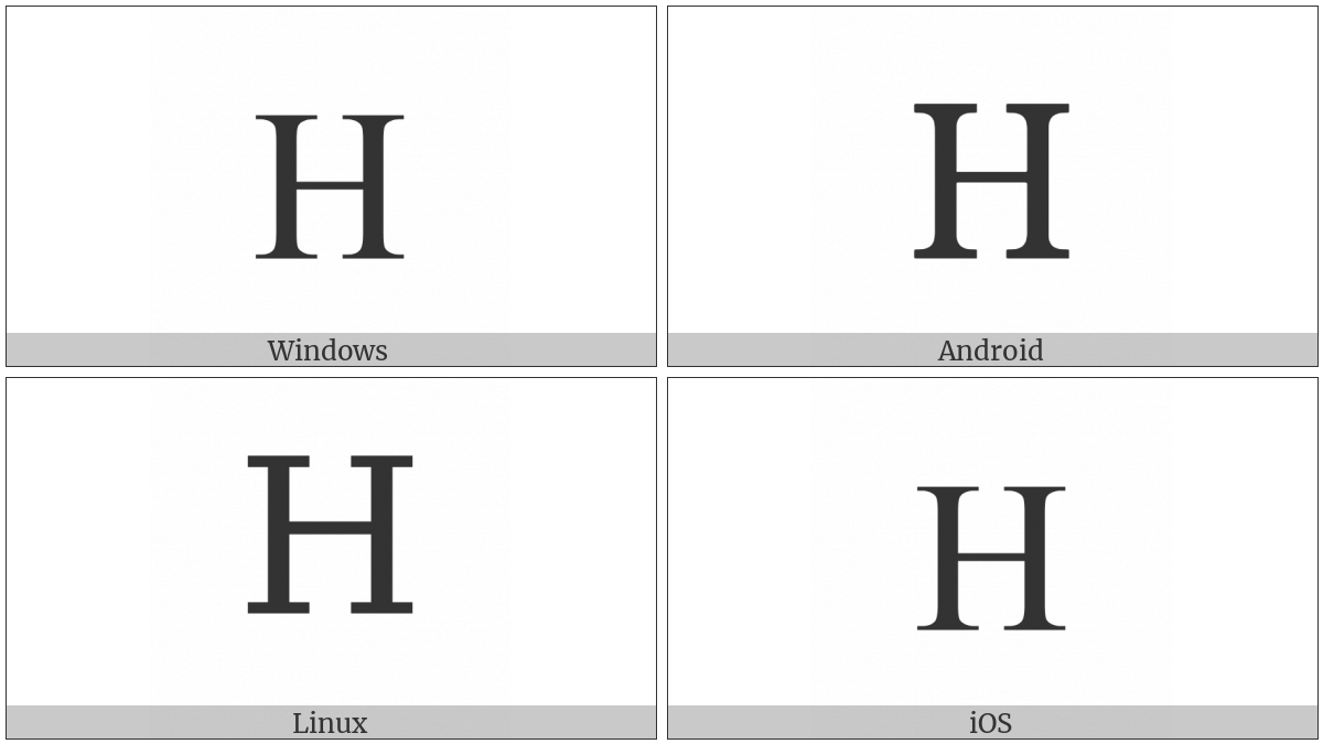 The image below shows how the “Cyrillic Capital Letter En” symbol might look like on different operating systems. If the font in which this web site is displayed does not contain the symbol and there is no fallback font able to render it, you can use the image below to get an idea of what it should look like.