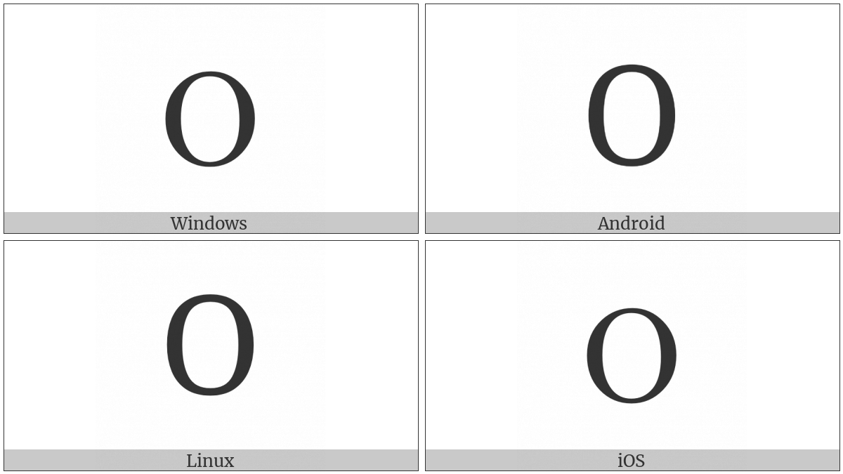 The image below shows how the “Cyrillic Capital Letter O” symbol might look like on different operating systems. If the font in which this web site is displayed does not contain the symbol and there is no fallback font able to render it, you can use the image below to get an idea of what it should look like.