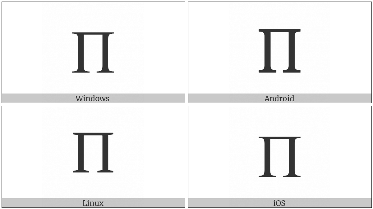 The image below shows how the “Cyrillic Capital Letter Pe” symbol might look like on different operating systems. If the font in which this web site is displayed does not contain the symbol and there is no fallback font able to render it, you can use the image below to get an idea of what it should look like.