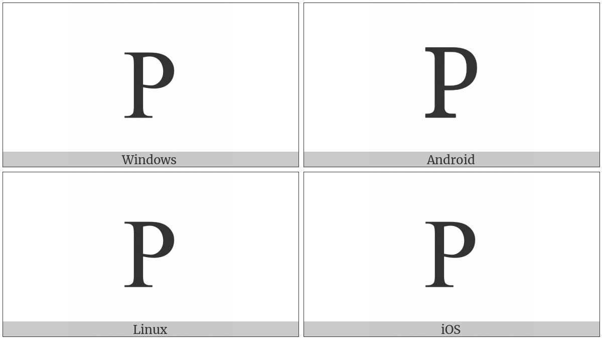The image below shows how the “Cyrillic Capital Letter Er” symbol might look like on different operating systems. If the font in which this web site is displayed does not contain the symbol and there is no fallback font able to render it, you can use the image below to get an idea of what it should look like.