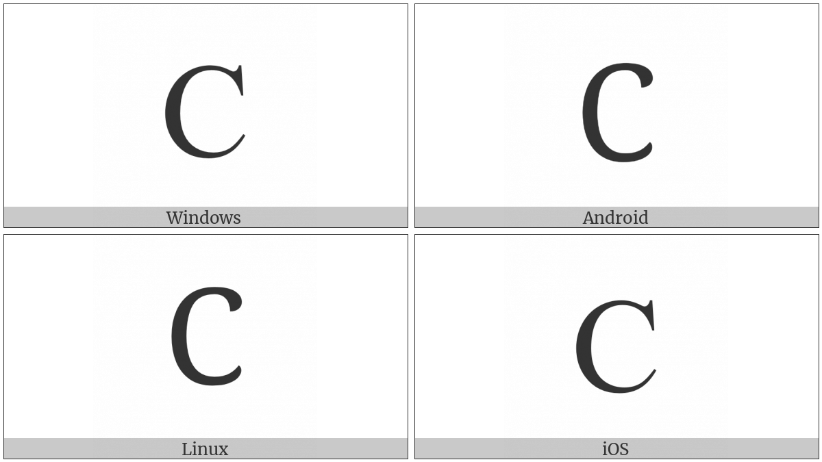 The image below shows how the “Cyrillic Capital Letter Es” symbol might look like on different operating systems. If the font in which this web site is displayed does not contain the symbol and there is no fallback font able to render it, you can use the image below to get an idea of what it should look like.