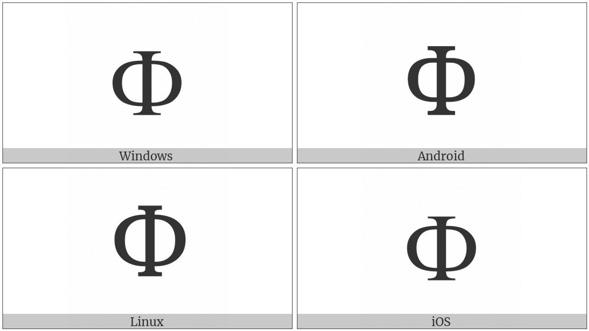 The image below shows how the “Cyrillic Capital Letter Ef” symbol might look like on different operating systems. If the font in which this web site is displayed does not contain the symbol and there is no fallback font able to render it, you can use the image below to get an idea of what it should look like.