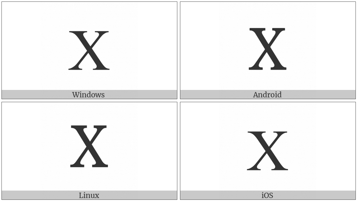 The image below shows how the “Cyrillic Capital Letter Ha” symbol might look like on different operating systems. If the font in which this web site is displayed does not contain the symbol and there is no fallback font able to render it, you can use the image below to get an idea of what it should look like.