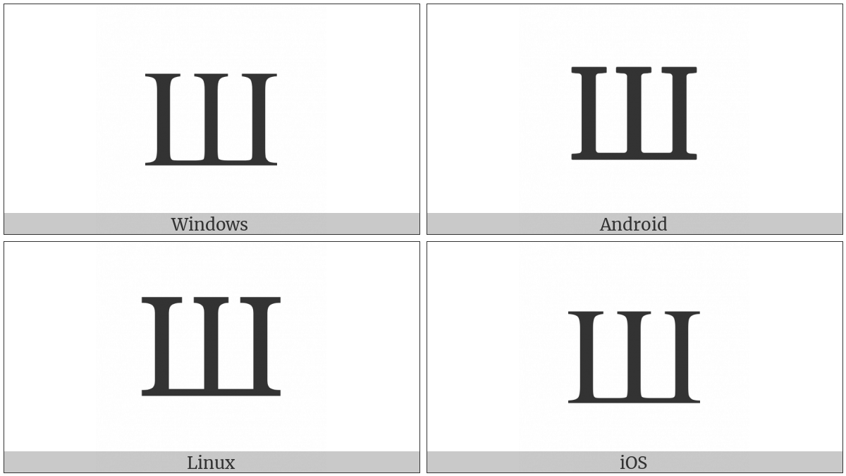 The image below shows how the “Cyrillic Capital Letter Sha” symbol might look like on different operating systems. If the font in which this web site is displayed does not contain the symbol and there is no fallback font able to render it, you can use the image below to get an idea of what it should look like.
