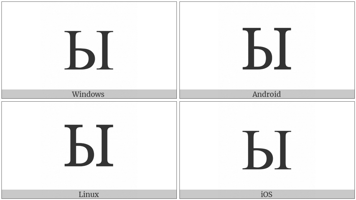 The image below shows how the “Cyrillic Capital Letter Yeru” symbol might look like on different operating systems. If the font in which this web site is displayed does not contain the symbol and there is no fallback font able to render it, you can use the image below to get an idea of what it should look like.