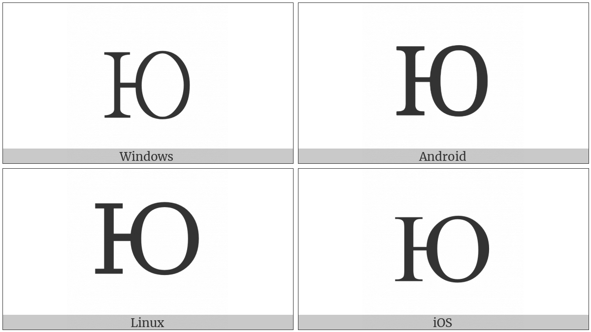 The image below shows how the “Cyrillic Capital Letter Yu” symbol might look like on different operating systems. If the font in which this web site is displayed does not contain the symbol and there is no fallback font able to render it, you can use the image below to get an idea of what it should look like.