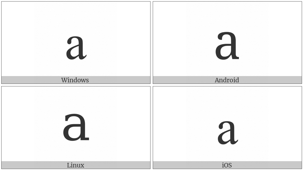 The image below shows how the “Cyrillic Small Letter A” symbol might look like on different operating systems. If the font in which this web site is displayed does not contain the symbol and there is no fallback font able to render it, you can use the image below to get an idea of what it should look like.