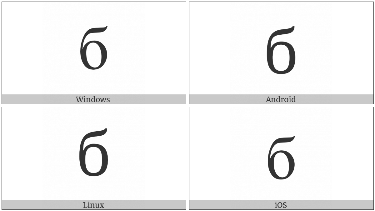 The image below shows how the “Cyrillic Small Letter Be” symbol might look like on different operating systems. If the font in which this web site is displayed does not contain the symbol and there is no fallback font able to render it, you can use the image below to get an idea of what it should look like.