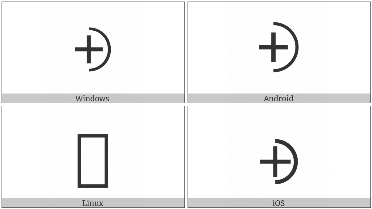 The image below shows how the “Plus Sign In Right Half Circle” symbol might look like on different operating systems. If the font in which this web site is displayed does not contain the symbol and there is no fallback font able to render it, you can use the image below to get an idea of what it should look like.