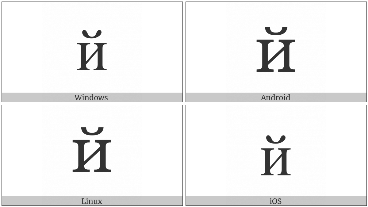 The image below shows how the “Cyrillic Small Letter Short I” symbol might look like on different operating systems. If the font in which this web site is displayed does not contain the symbol and there is no fallback font able to render it, you can use the image below to get an idea of what it should look like.
