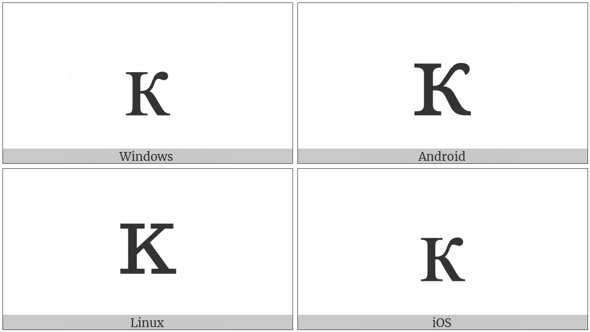 The image below shows how the “Cyrillic Small Letter Ka” symbol might look like on different operating systems. If the font in which this web site is displayed does not contain the symbol and there is no fallback font able to render it, you can use the image below to get an idea of what it should look like.