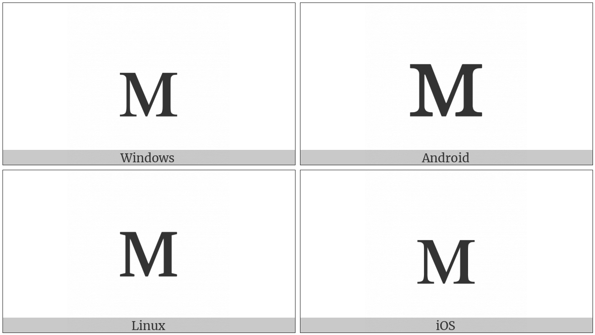 The image below shows how the “Cyrillic Small Letter Em” symbol might look like on different operating systems. If the font in which this web site is displayed does not contain the symbol and there is no fallback font able to render it, you can use the image below to get an idea of what it should look like.