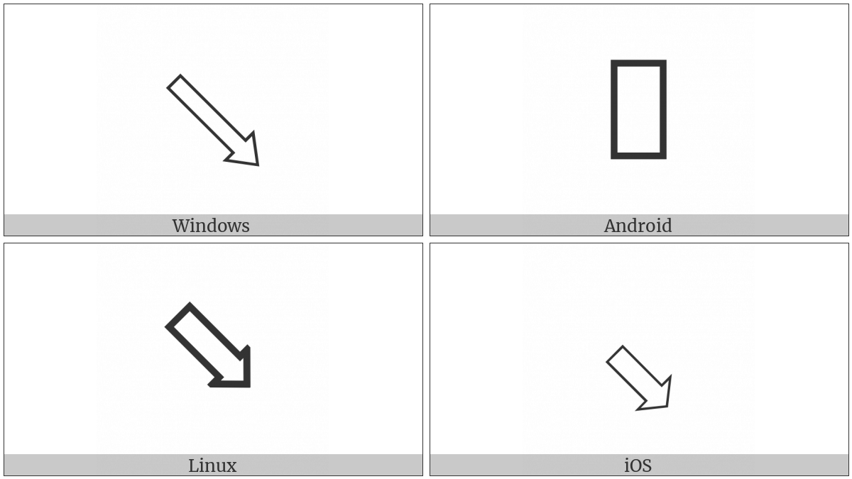 The image below shows how the “South East White Arrow” symbol might look like on different operating systems. If the font in which this web site is displayed does not contain the symbol and there is no fallback font able to render it, you can use the image below to get an idea of what it should look like.