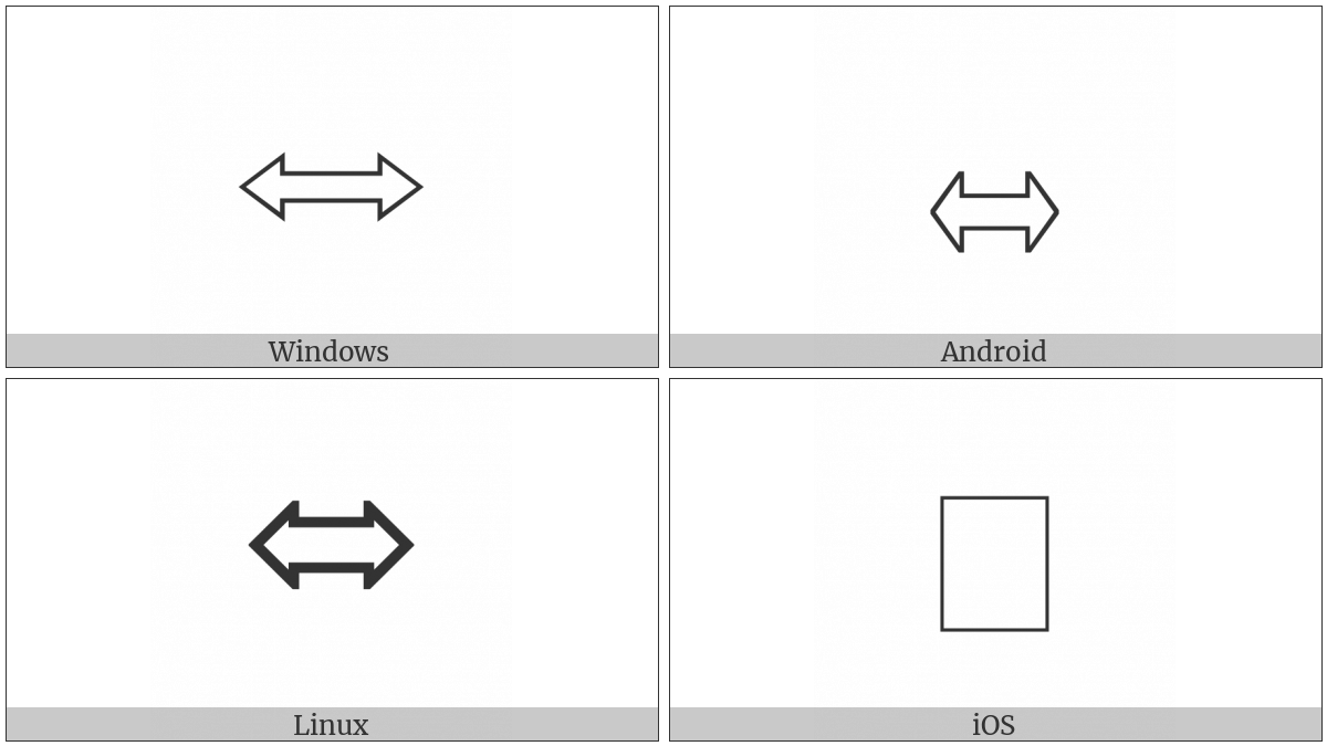 The image below shows how the “Left Right White Arrow” symbol might look like on different operating systems. If the font in which this web site is displayed does not contain the symbol and there is no fallback font able to render it, you can use the image below to get an idea of what it should look like.