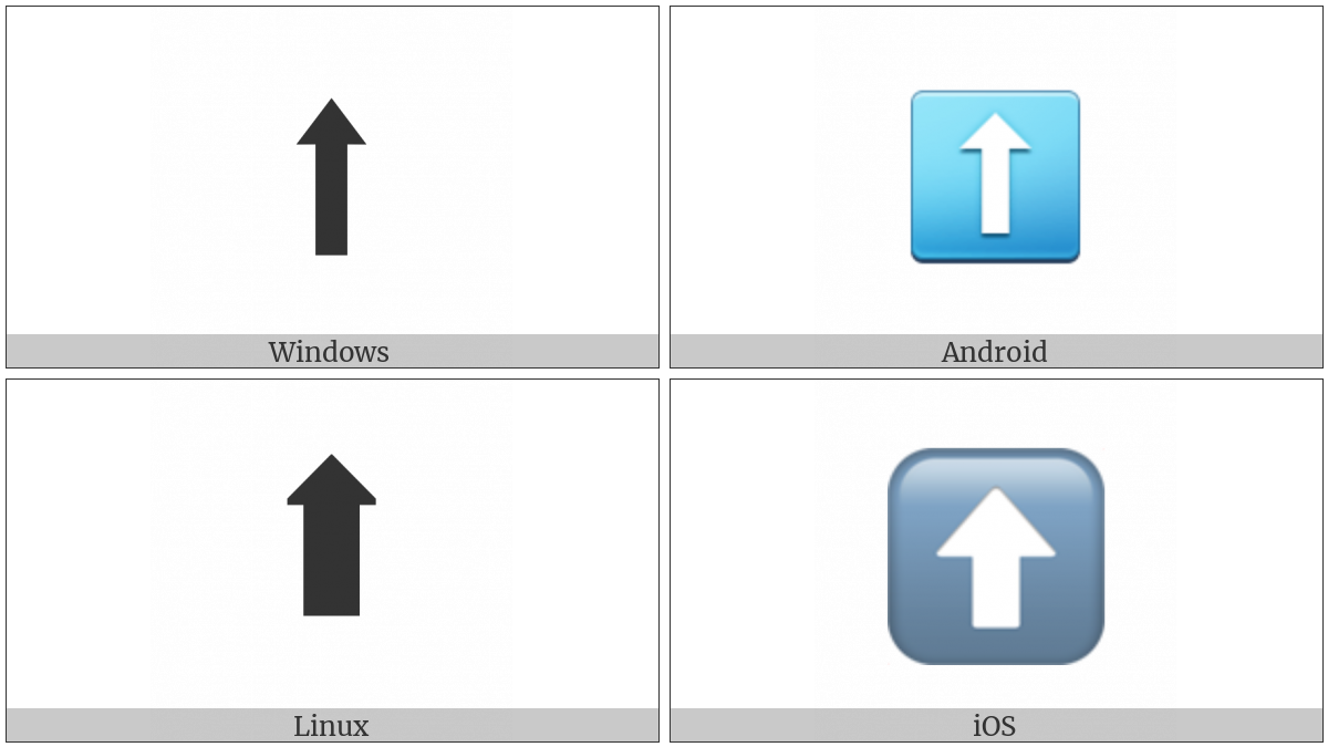 The image below shows how the “Upwards Black Arrow” symbol might look like on different operating systems. If the font in which this web site is displayed does not contain the symbol and there is no fallback font able to render it, you can use the image below to get an idea of what it should look like.