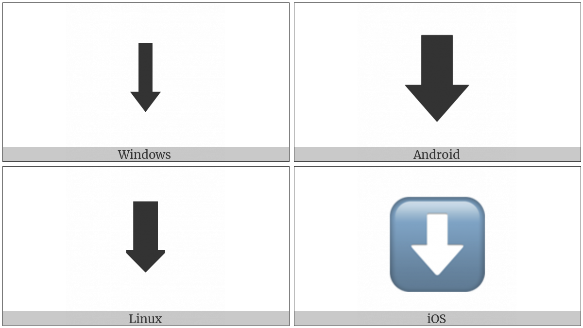 The image below shows how the “Downwards Black Arrow” symbol might look like on different operating systems. If the font in which this web site is displayed does not contain the symbol and there is no fallback font able to render it, you can use the image below to get an idea of what it should look like.