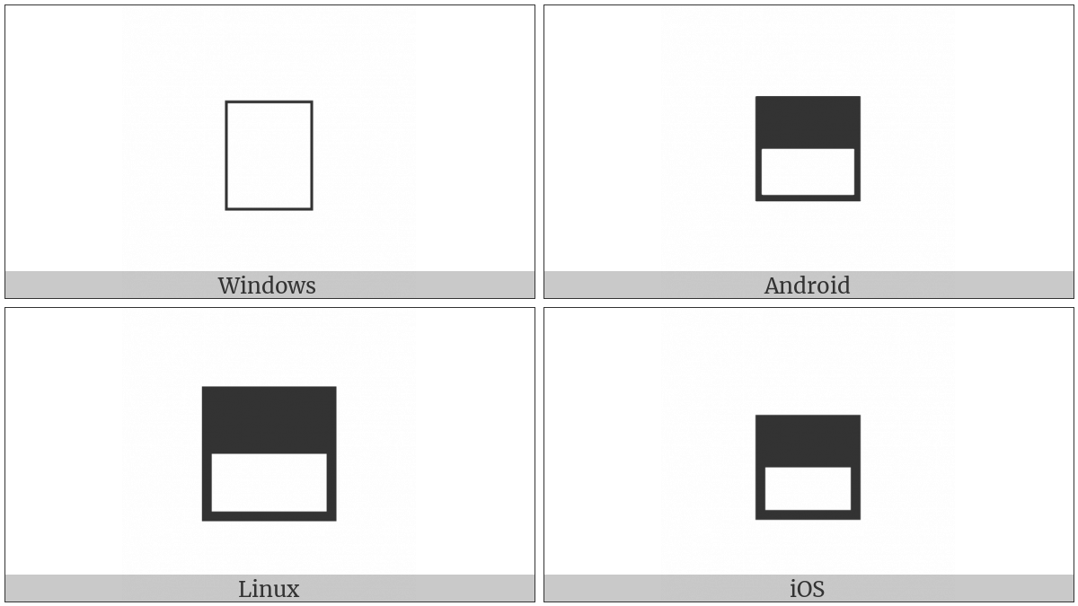 The image below shows how the “Square With Top Half Black” symbol might look like on different operating systems. If the font in which this web site is displayed does not contain the symbol and there is no fallback font able to render it, you can use the image below to get an idea of what it should look like.