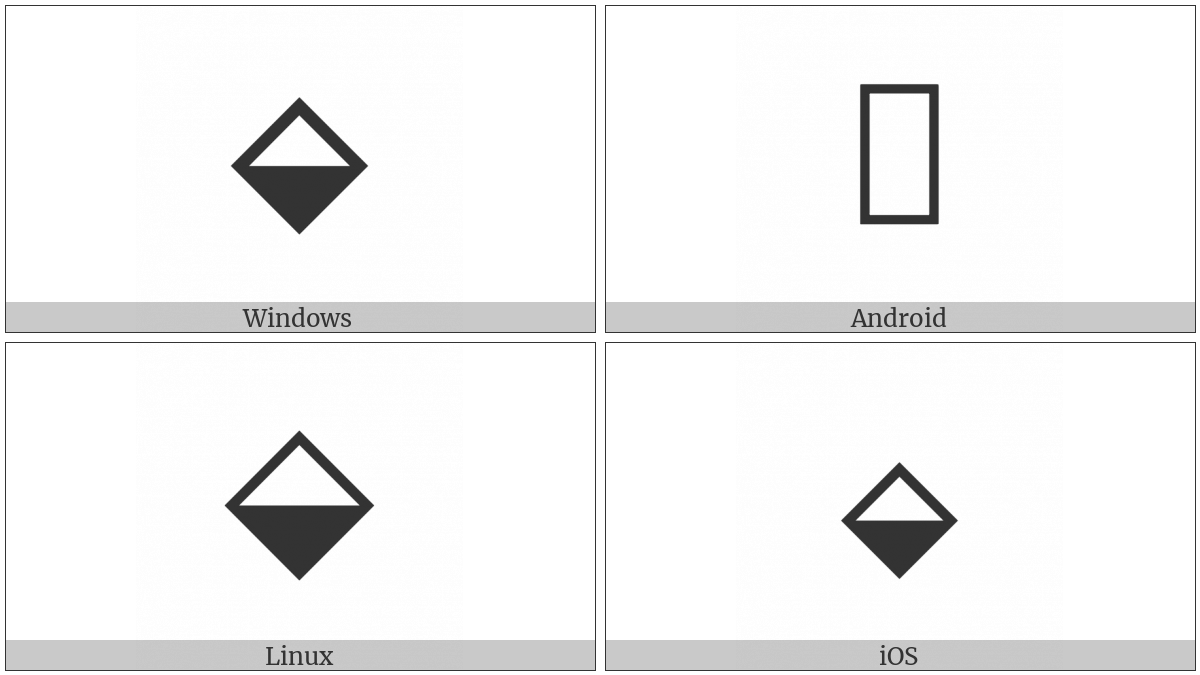 The image below shows how the “Diamond With Bottom Half Black” symbol might look like on different operating systems. If the font in which this web site is displayed does not contain the symbol and there is no fallback font able to render it, you can use the image below to get an idea of what it should look like.