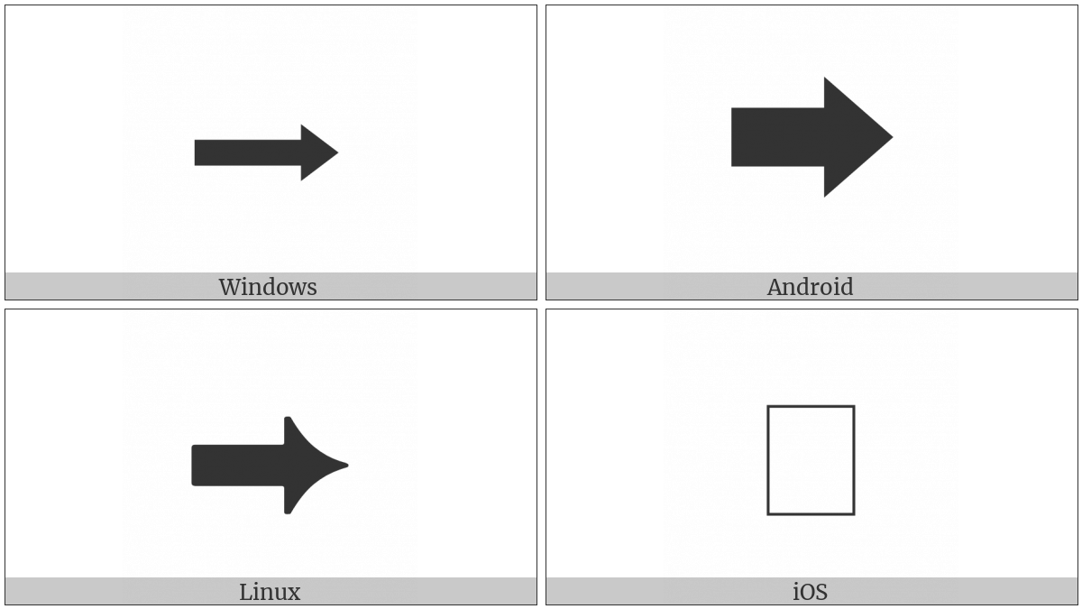 The image below shows how the “Rightwards Black Arrow” symbol might look like on different operating systems. If the font in which this web site is displayed does not contain the symbol and there is no fallback font able to render it, you can use the image below to get an idea of what it should look like.