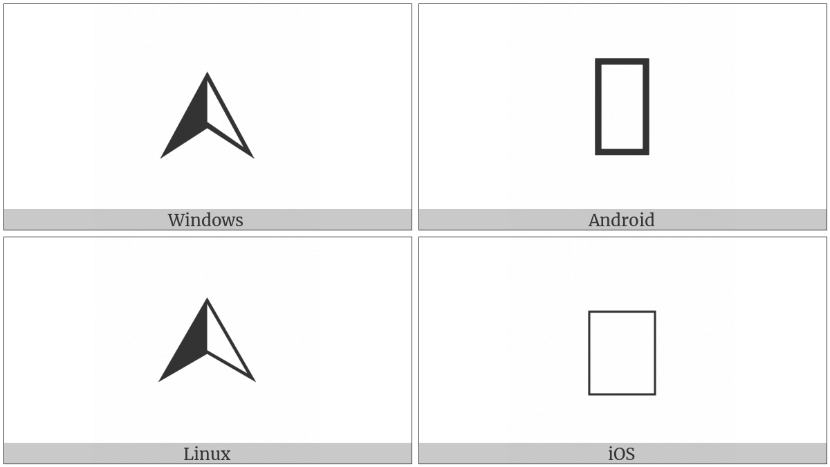 The image below shows how the “Three-D Right-Lighted Upwards Equilateral Arrowhead” symbol might look like on different operating systems. If the font in which this web site is displayed does not contain the symbol and there is no fallback font able to render it, you can use the image below to get an idea of what it should look like.