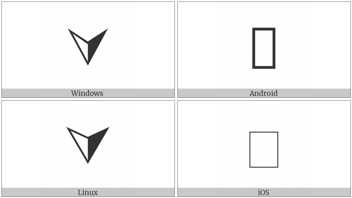 The image below shows how the “Three-D Left-Lighted Downwards Equilateral Arrowhead” symbol might look like on different operating systems. If the font in which this web site is displayed does not contain the symbol and there is no fallback font able to render it, you can use the image below to get an idea of what it should look like.