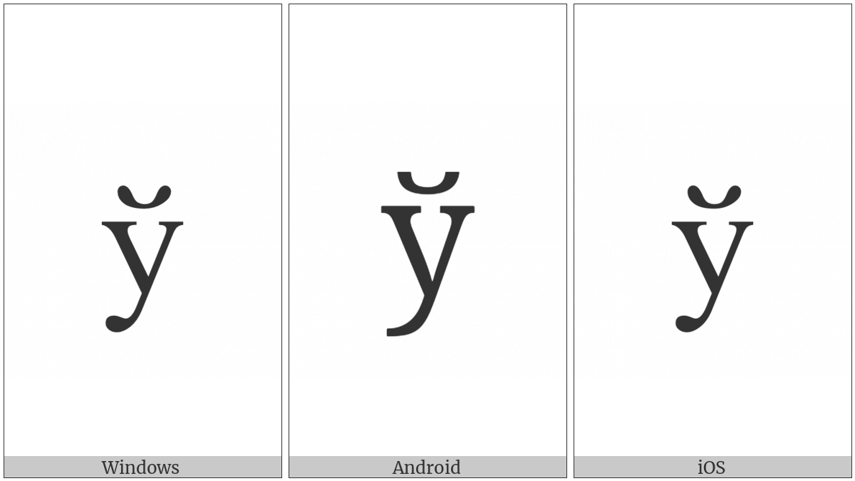 The image below shows how the “Cyrillic Small Letter Short U” symbol might look like on different operating systems. If the font in which this web site is displayed does not contain the symbol and there is no fallback font able to render it, you can use the image below to get an idea of what it should look like.