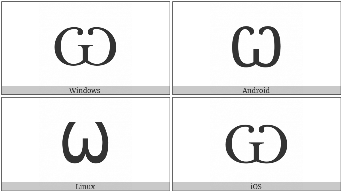The image below shows how the “Cyrillic Capital Letter Omega” symbol might look like on different operating systems. If the font in which this web site is displayed does not contain the symbol and there is no fallback font able to render it, you can use the image below to get an idea of what it should look like.